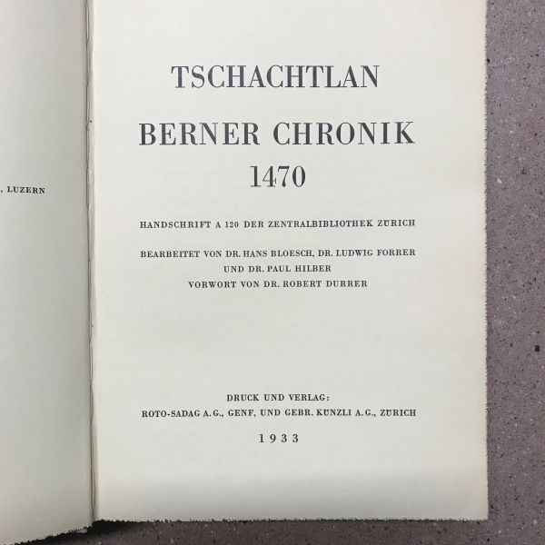 Tschachtlan Berner Chronik 1470 Vorwort von Robert Durrer, Bloesch Hans, Forrer Ludwig und Hilber Paul. Verlag Genf Druck und Verlag Roto-Sadag und Zürich, Gebr. Kuenzli 1933Jh. 231 teils farbige faksimilierte Tafeln. Schweizerische Buchmalerei. Herausgegeben von Dr. Paul Hilber unter Mitarbeit,,,,, sehr guter Zustand.
