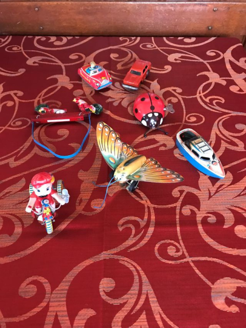 Blechspielzeug Konvolut, Dreirad, Schmetterling, Schiff, Marienkäfer, pickende Hühner und zwei verschiedene Autos, mehrheitlich gut bis sehr guter Zustand, alle ohne orig. Verpackungen.