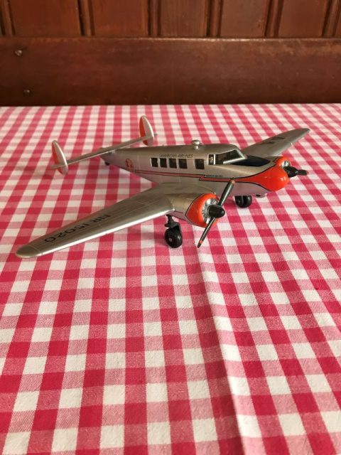 Modellflugzeug Kunststoff New Ray, American Airlines NR 15020, 2 motorig, Farbe silber und orange, L 21 B 28 und H 7cm, war stets in einer Vitrine aufbewahrt.